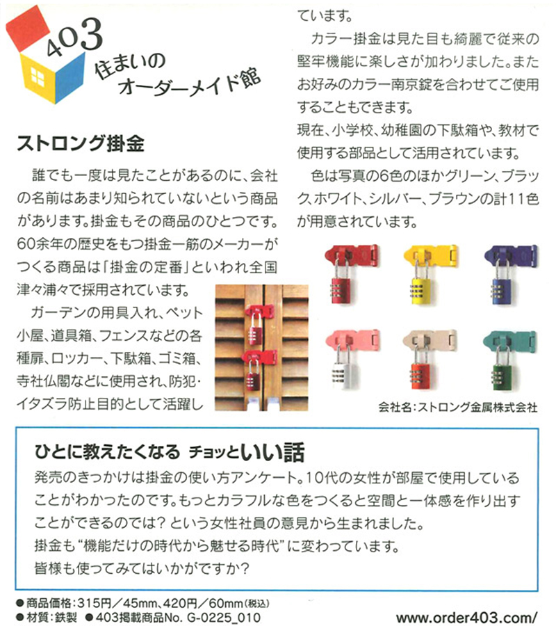 「DIY、建築金物製造販売」 なら 「ストロング金属 株式会社」へ! ◆◇◆ ストロング金属 株式会社 からのお知らせ ◆◇◆ ストロングカラー掛金鉄製の焼付塗装加工によるカラフルな6色。 掛金=重厚感のイメージから オシャレなライト感覚の掛金をご提案します。