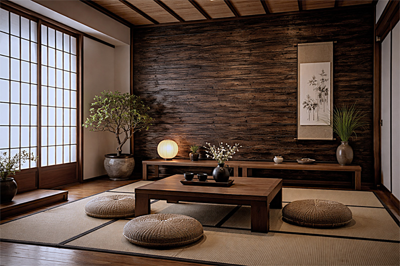 焼き杉独特の重厚感は、シックで高級なを印象を醸し出し、さらに自然な風合いが、お部屋を上品で落ち着いた空間にします。