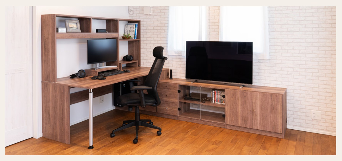 新色2カラーを使って組み立てた家具をご紹介! ウォルナット活用事例-1デスクとテレビ台の一体型収納