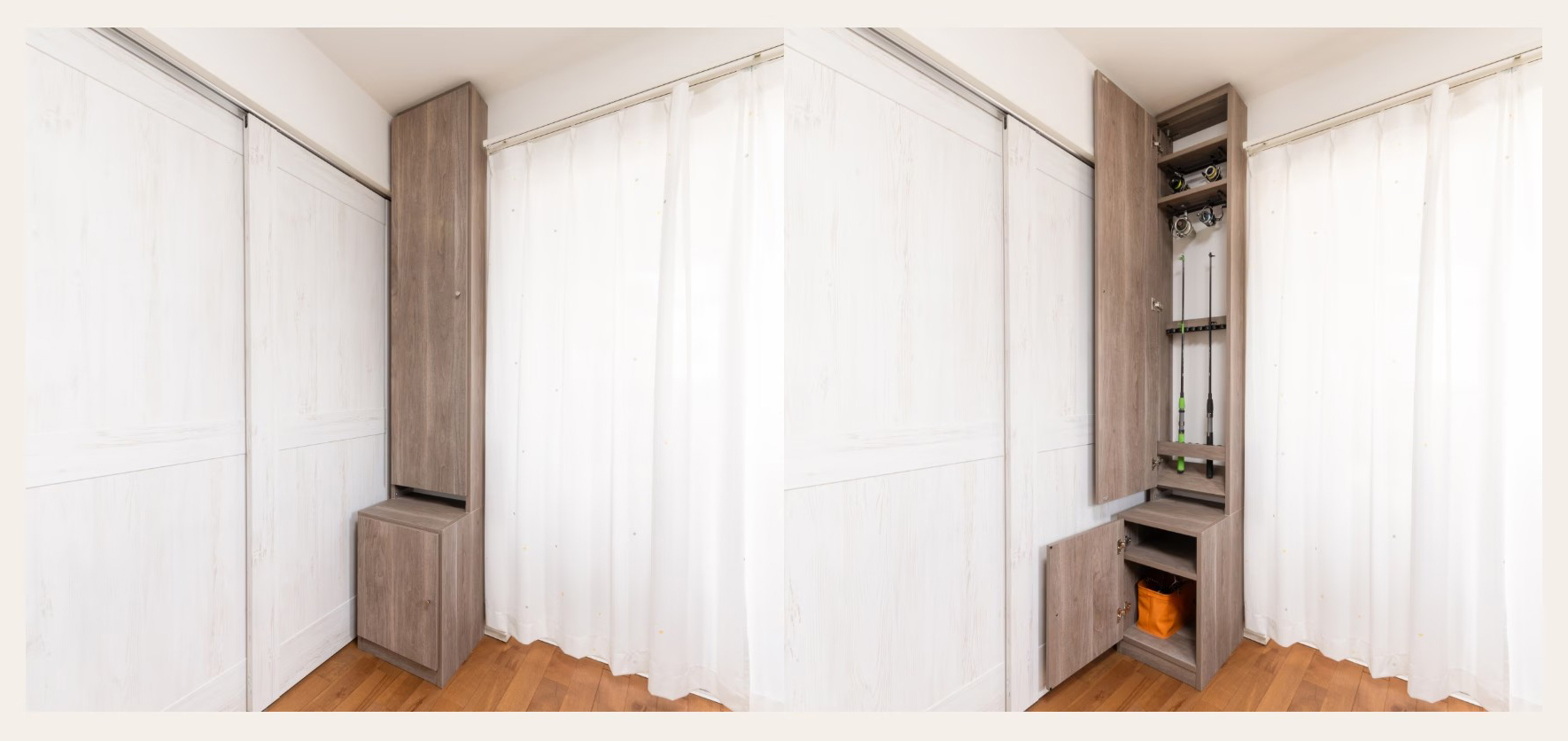 グレイウッド活用事例-1部屋のデッドスペースを有効活用 釣竿も専用の収納で安全に保管でき、部屋全体がスッキリ。