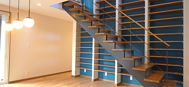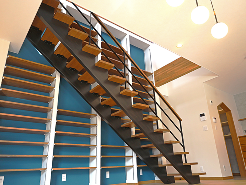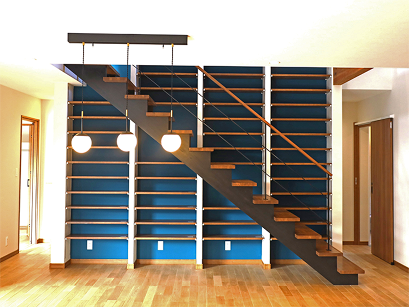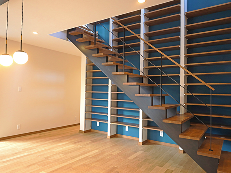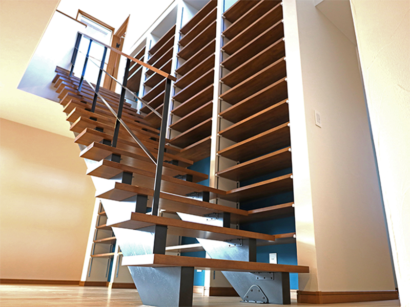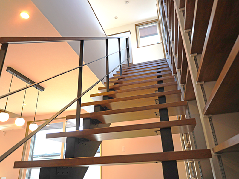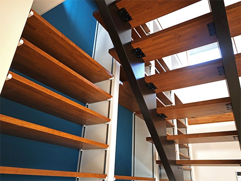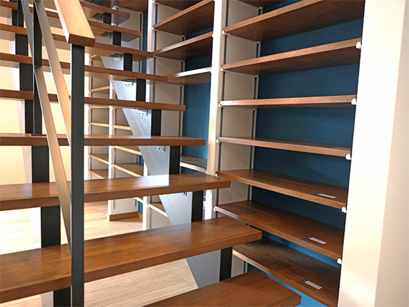 階段はオープン仕様のひな壇階段。 動線と省スペースに配慮した大容量の収納力でありながら、空間をまるごとおしゃれに見せる、施主様のこだわりが光る施工事例です。