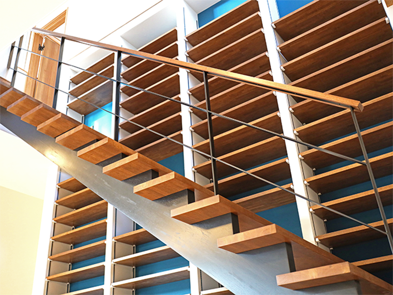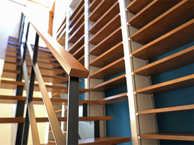 階段との一体感を持たせるため、部材はダーク系のブラウンとブラックで統一。