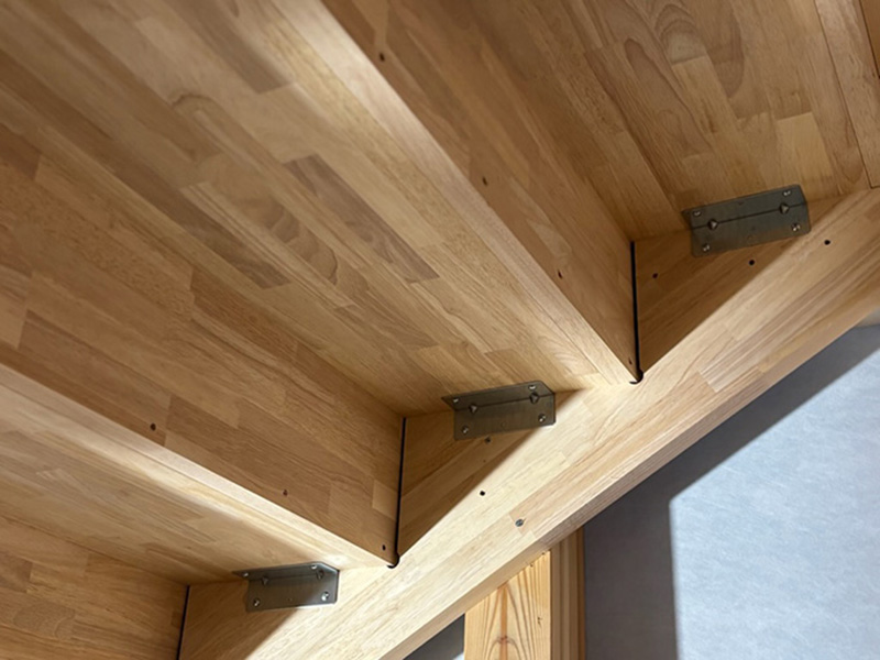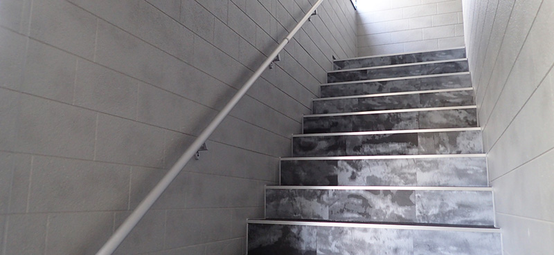 段鼻の出寸法を0mmとすることで、仕上げ材の施工性を高め、現場での作業効率向上に配慮した仕様となっています。 こちらの事例では、施工途中の下地の状態と、シート貼りによる仕上げ後の様子を掲載しています。