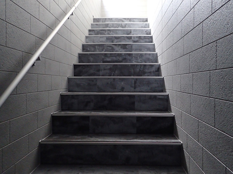 段鼻0mmで仕上げやすい、集合住宅向け下地階段 集合住宅向けに、現場でのシート貼り仕上げに対応した下地階段を施工しました。