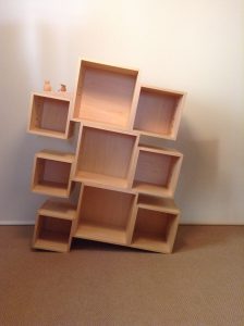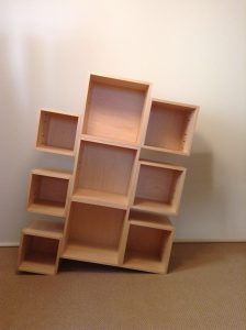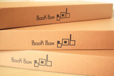 A4版・単行本・文庫本などがそれぞれ収まる、大きさの違う3つの箱をずらして繋げた本箱「ボブ」。
