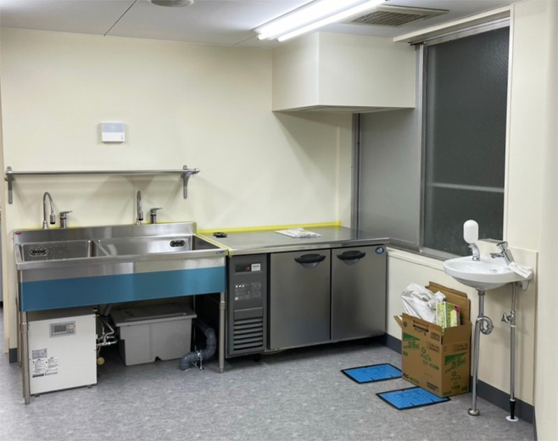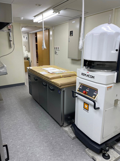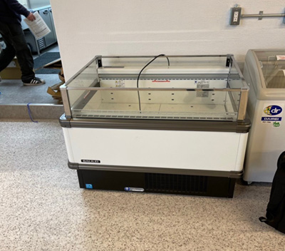 店舗側にも冷蔵、冷凍の食品ケースを設置 パンを並べるディスプレー什器を待ちます
