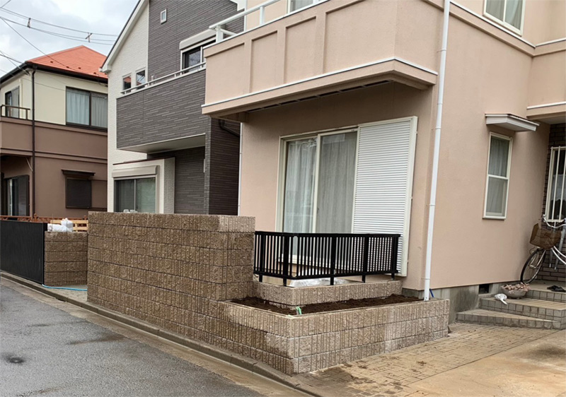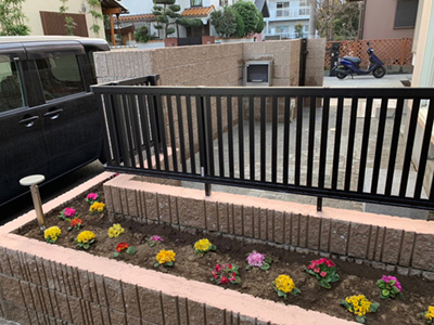 化粧ブロックの壁に一体化した花壇を組み込みました