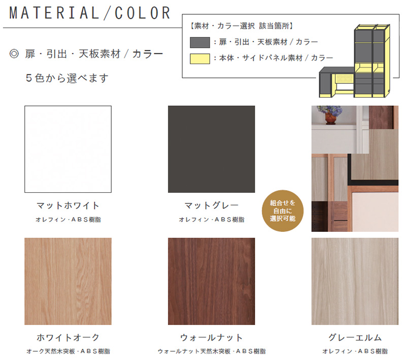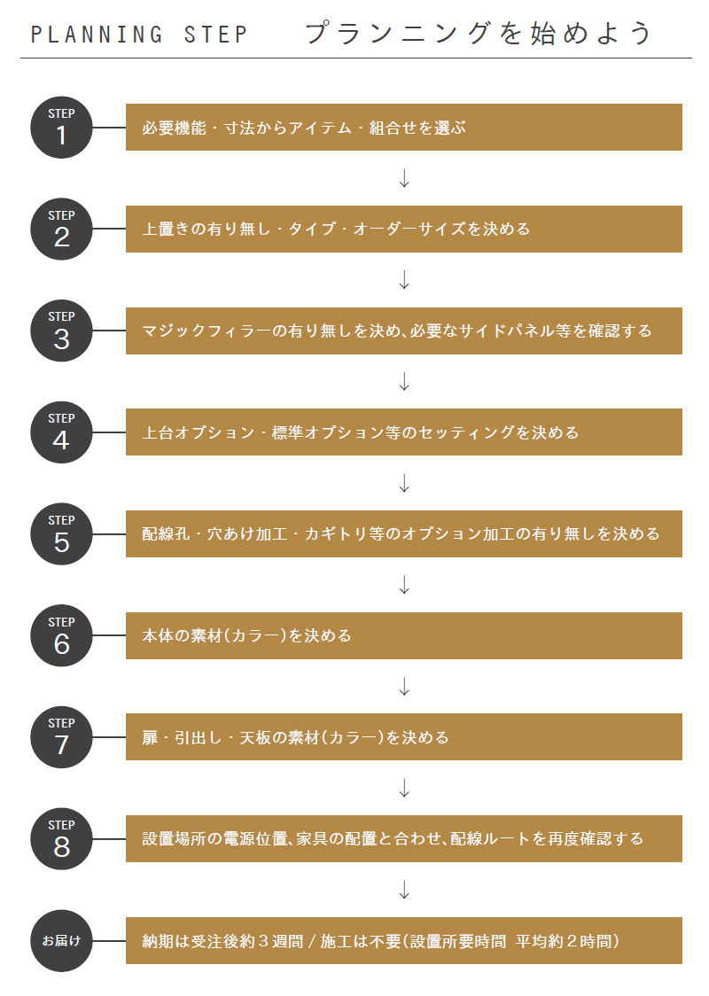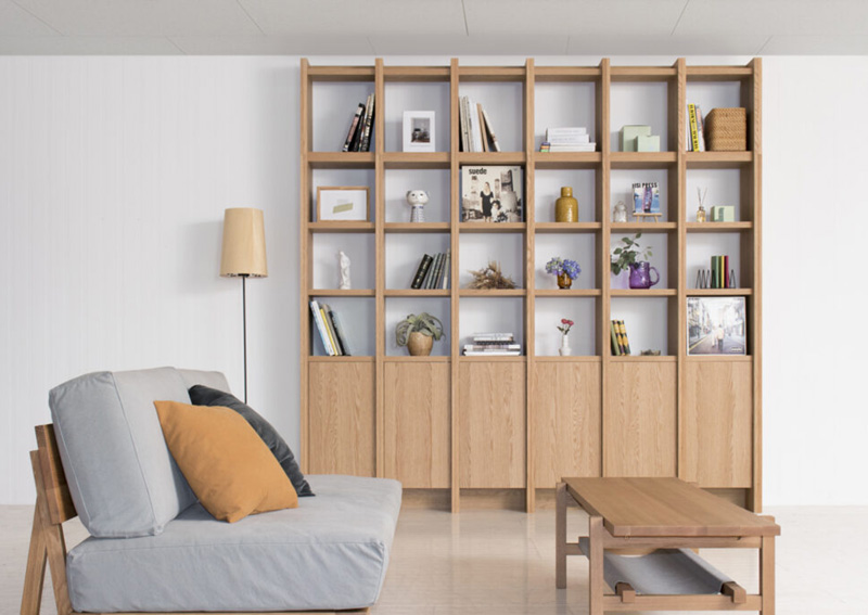 軸となる考えすえ木工の壁面収納は、初めて購入されるお客様でもスムーズに検討して頂けるよう、まずは欲しい機能・サイズに合わせて。決まった形のアイテムを選ぶことから始まります。 “お部屋に合わせて イージ−オ−ダ−” これは、発売当初から変わらない考え方です。 選ぶ楽しさ