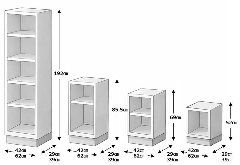 奥行きは、29cmと39cmの2種類、幅は42cmと62cmの2種類の他に、デスクやテレビボード対応などのいくつかのバリエーションがあります。