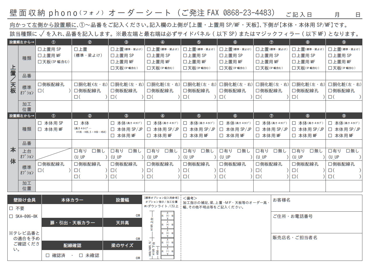 唯一になる選んでいくうちに愛情が沸く、そんな気持ちをもつのも家具の魅力、そこに立ちはだかる様々な問題、梁や柱などの障害物、コンセントやスイッチといった設備類、それらによってお客さもの家具選びが壁にぶつかってしまわないように・・・。 Phonoの特徴