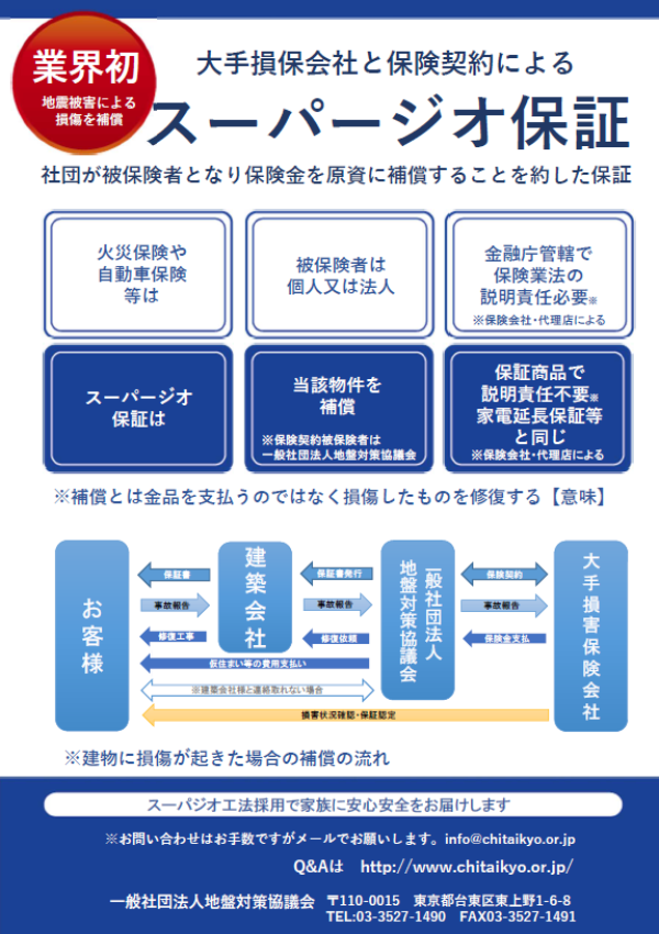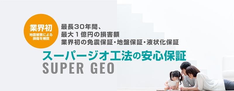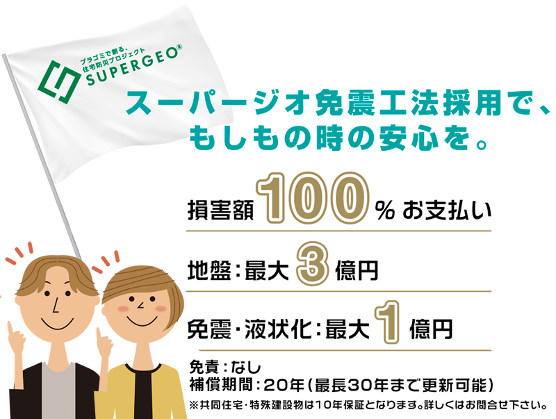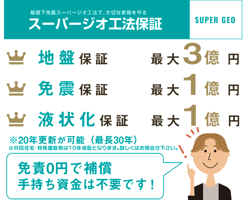 業界初!地盤保証、免震保証、液状化保証!最長30年間、最大1億円の損害額!住宅免震システム「スーパージオ工法保証」は損害額100%お支払い!