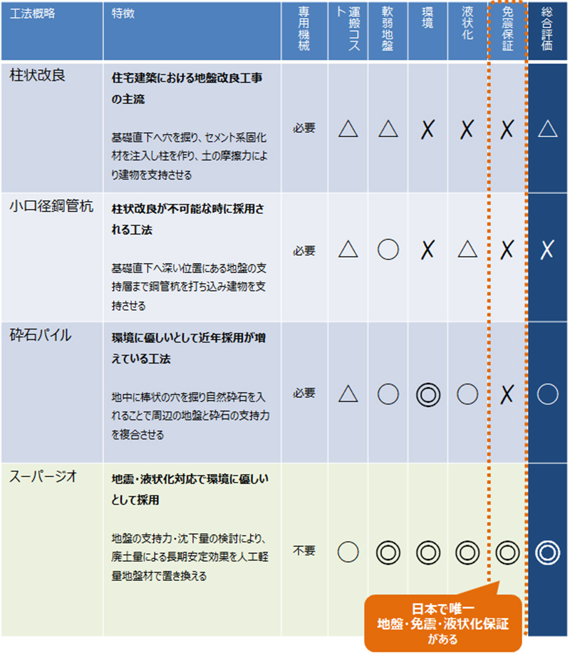日本で唯一!地盤・免震・液状化保証があるスーパージオ工法 他の地盤改良工法や免震工法との比較です!安心の住まいを 住宅免震システム「スーパージオ工法」他の工法との比較