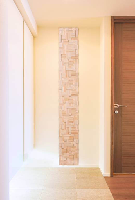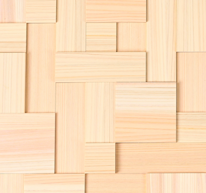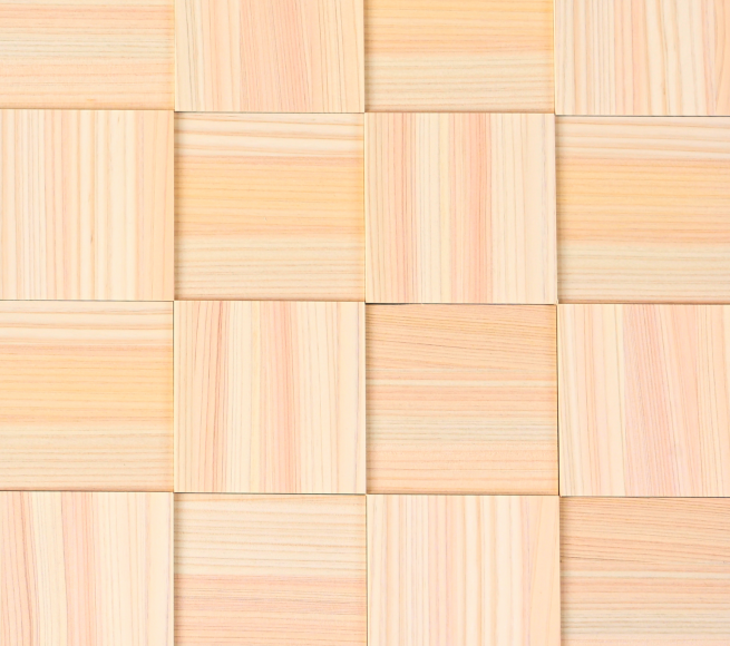 津山産の最高品質の檜を職人の手で1ピースずつ手間を掛けて嵌め込みました。イマガワの壁面パネル