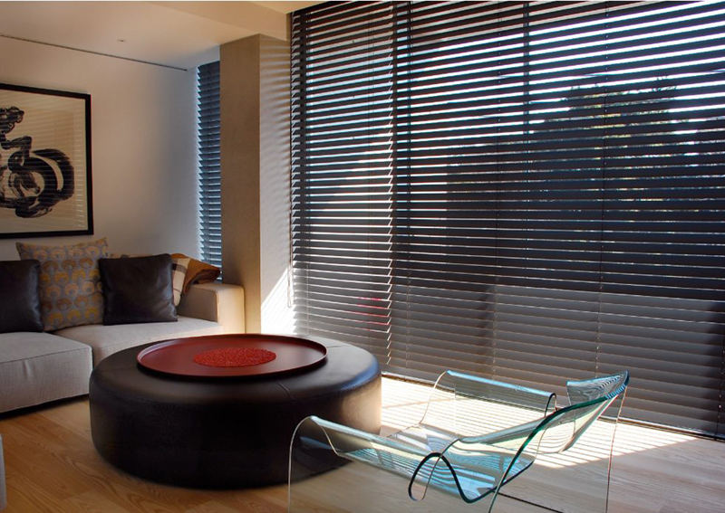 光の調整ができるウッドブラインドは、ダークトーンでも重たくなりすぎずに、