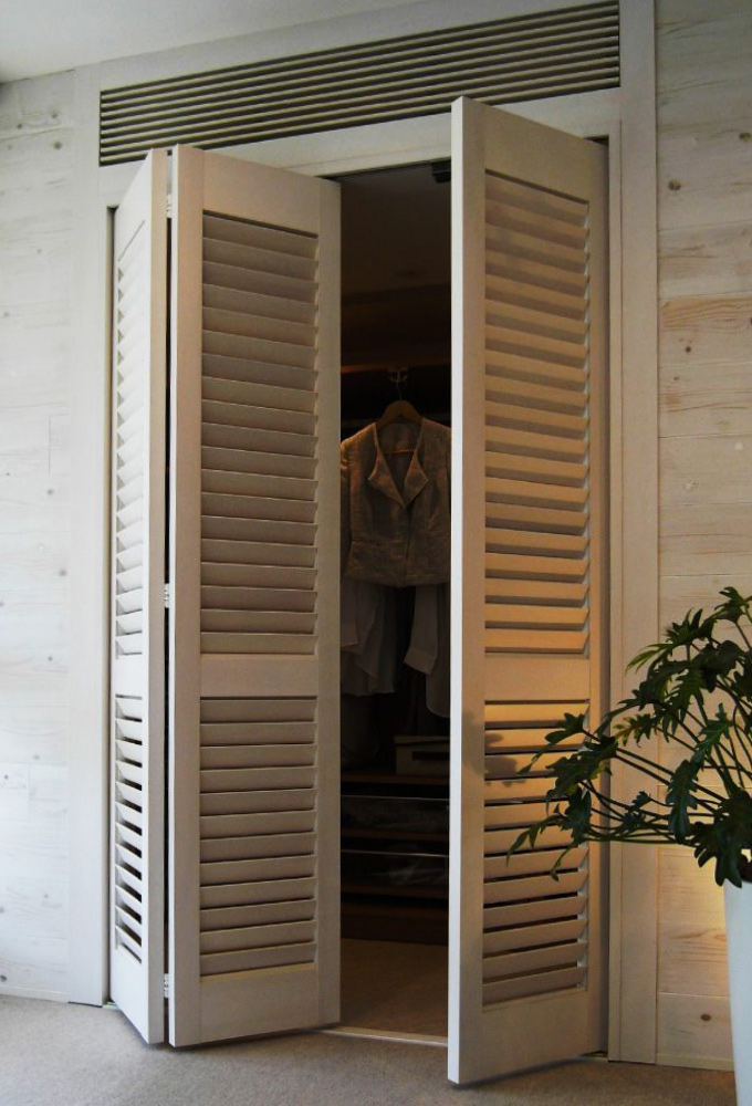 自然と一体になったような静謐な空間です。 寝室ウォークインクローゼットの扉に、ウッドシャッターを使用した寝室。