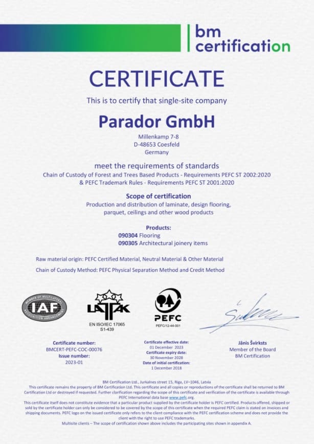 また、ヨーロッパ圏では一般的に、長期使用により生じるキズや凹み、日焼けなどに対して、約15〜20年後を目安に「表面研磨再塗装(サンディング&リフィニッシュ)」を行い、新たな表面を再生することで、さらに長くご使用いただくメンテナンス手法が採用されています。 より良い暮らしの為のエレメントとして、パラドールフローリングを是非ご採用ください。 生産国パラドールフローリング生産は、「品質確保」・「環境配慮」・「安定供給」が確保されたドイツ国Parador社オーストリア工場にて行われています。