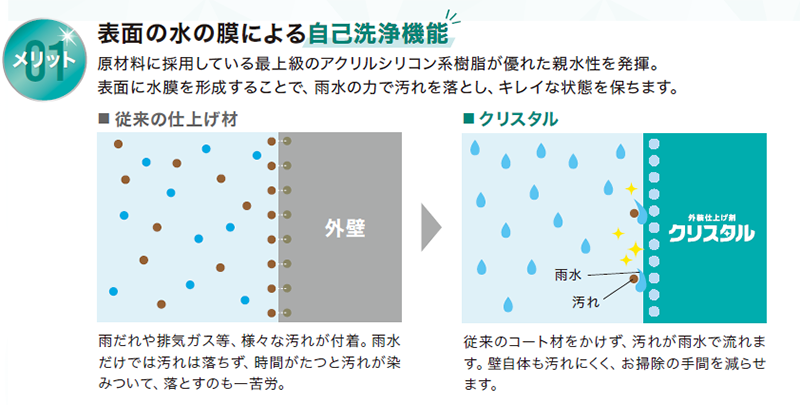 「外装仕上材クリスタル」は、塗りたてのきれいな仕上がりを長く維持する機能がたくさんつまっています。あなたの家の外壁をよりカンタンに美しく保ちます。 「クリスタル」のメリット