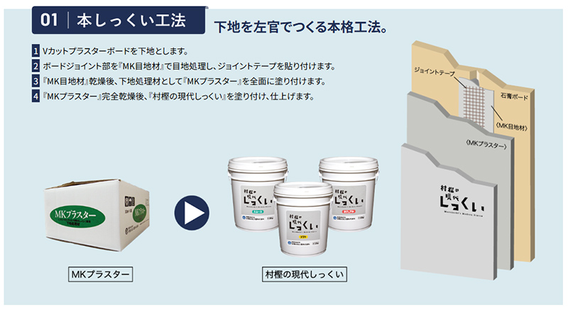 栃木県で創業以来170年にわたり、消石灰・しっくいの製造販売を主業としてきた村樫石灰工業のしっくい製品での施工が基本となります。