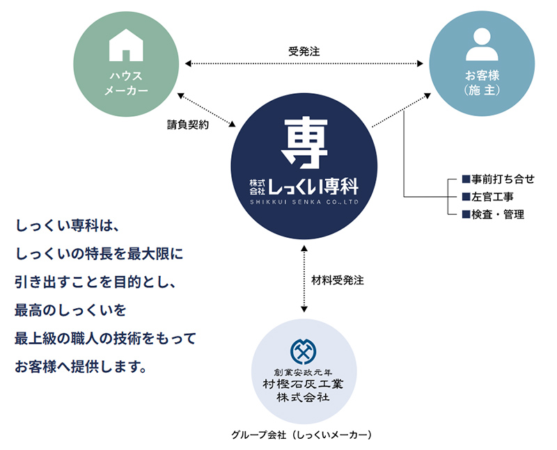 事業の流れ今まで、しっくいを製造する会社と、施工する会社は別会社であることが一般的でしたが、しっくい専科では、材工一括でのスピーディーかつ、信頼性を高めた対応を実践しております。