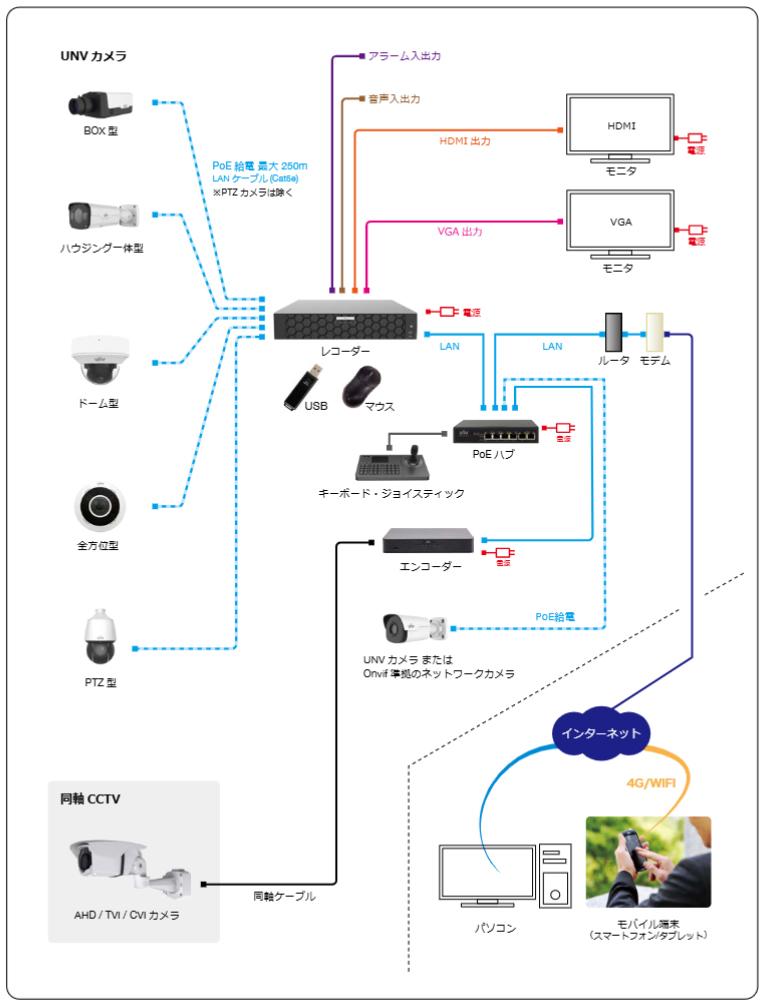 撮影映像はHDDレコーダーなどの録画機器に記録・保存され、映像の確認は同軸ケーブルが敷設してある設置拠点内でのみ可能です。 ネットワーク(IP)カメラ