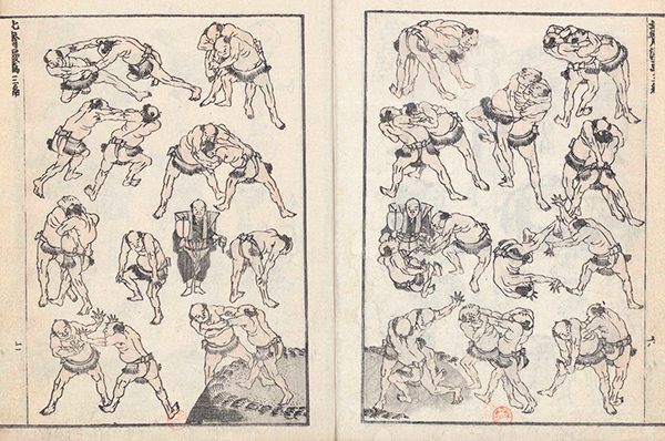 葛飾北斎「北斎漫画 三編、相撲の様子を捉えた絵図」
