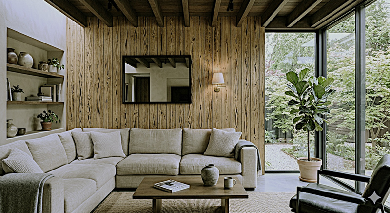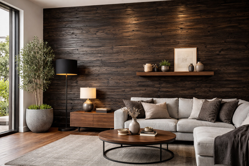 焼き杉独特の重厚感は、シックで高級なを印象を醸し出し、さらに自然な風合いが、お部屋を上品で落ち着いた空間にします。