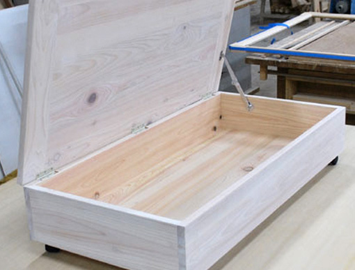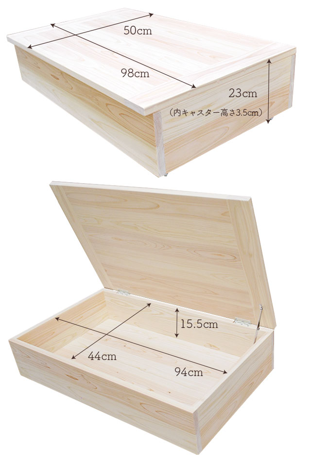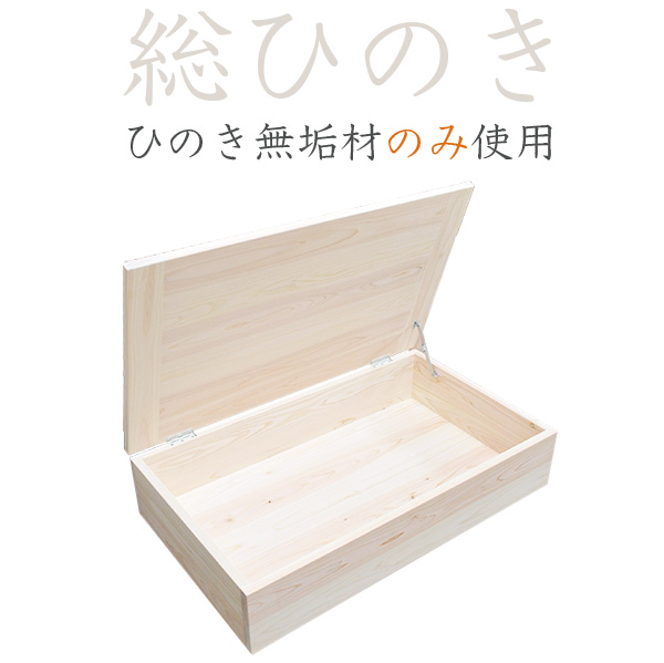 「ひのき家具の企画・製造・販売」 なら 「株式会社 ヒノキ・ワークス」へ! 国産ひのきベッド下用フタ付き収納BOX無垢ひのきが湿気を吸収、蓋つきで埃からも守れるベッド下にピッタリの収納BOXです。