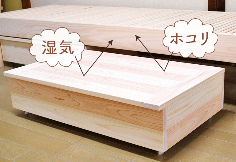蓋付きだからホコリも安心。無垢ひのきが水分を吸収し排出するから湿気からも守ってくれます。