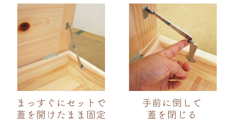 金具をまっすぐにセットすれば、蓋を開けたまま固定できます。