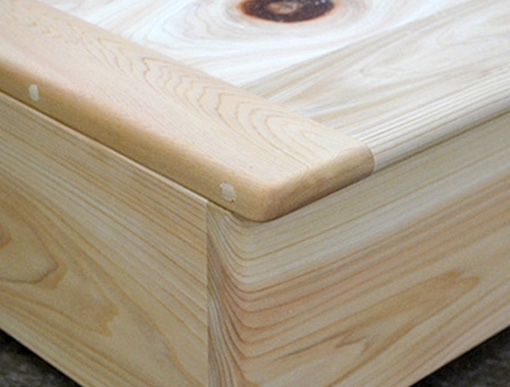 ひのきベッド下用フタ付き収納BOXは総ひのきです。 【ココを比べて!知って!】あまり知られていないことですが、「無垢材使用」「オーク」「ウォールナット」など木の名前が記載してあっても、無垢家具ではない商品が世の中には溢れています。一部だけに無垢材が使用されていたり、木の表面を薄く剥いで、ベニヤ板などに貼られている場合があります。ヒノキ・ワークスの家具はそのような作り方と全く異なる総ひのき無垢家具です。