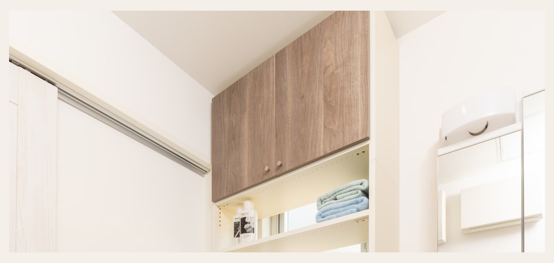 グレイウッド活用事例-2スッキリ整頓!ランドリー収納 洗剤やタオルをきれいに整理。洗濯機周りが広々と使え、見た目も機能も大満足。高さや幅を調整して、洗濯機の上にぴったりフィットする収納スペースを作成。