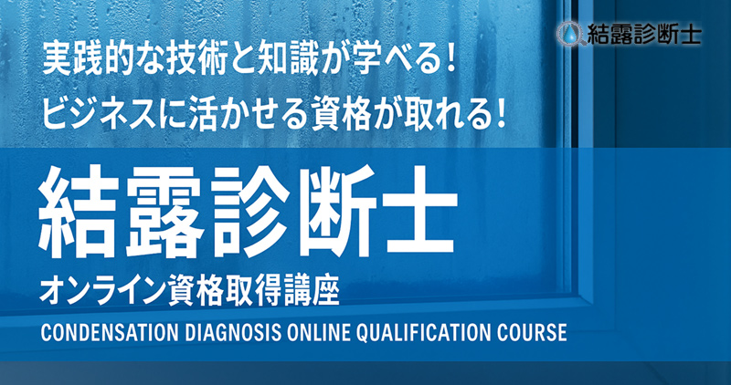 【結露診断士】資格取得講座のカリキュラム【結露診断士】資格取得講座は、建築士、施工管理者、住宅診断士など、結露問題に携わる全ての専門家に向けたオンラインによるeラーニング形式の実践型プログラムです。 結露の発生原理から被害、分類、対策、診断方法までを体系的に学べ、冬型の結露はもちろん、最近問題になっている夏型結露、通年型結露など、実例を交え、住宅・建築の結露防止と診断力を高めます。