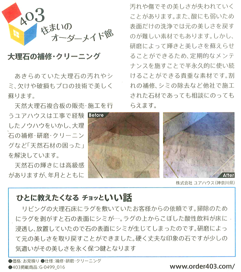 「天然石複合版・シートの輸入、販売、施工」 なら 「株式会社 ユアハウス」へ! 天然大理石の補修・研磨・クリーニング