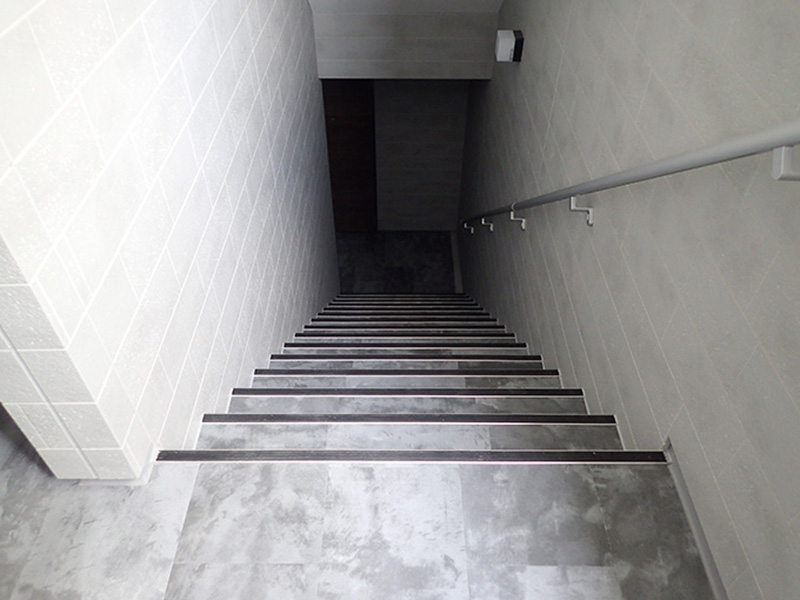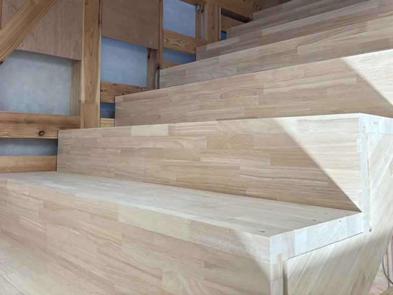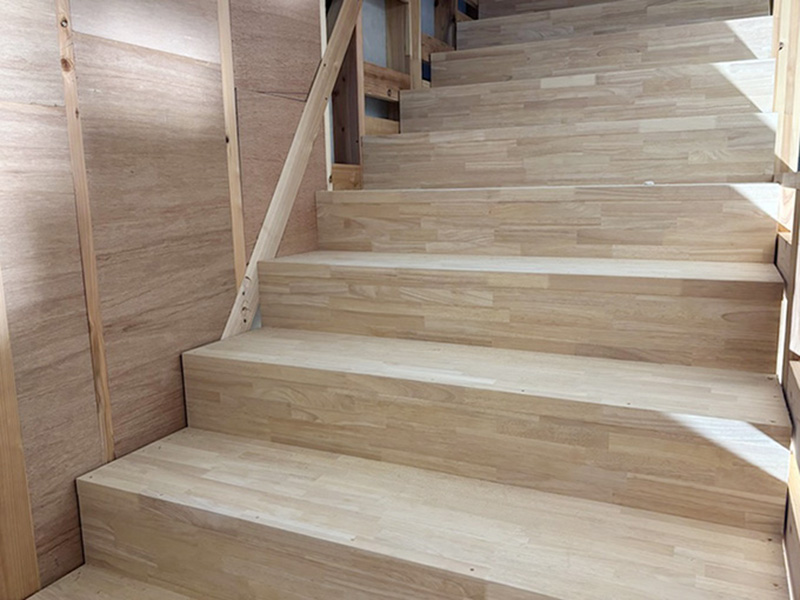 段鼻の出寸法を0mmとすることで、仕上げ材の施工性を高め、現場での作業効率向上に配慮した仕様となっています。 こちらの事例では、施工途中の下地の状態と、シート貼りによる仕上げ後の様子を掲載しています。