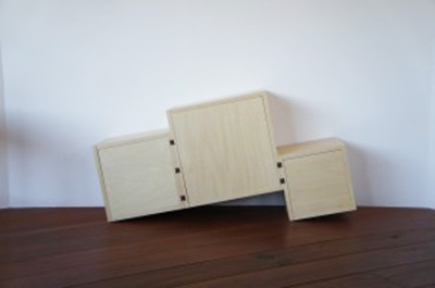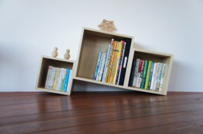 A4版・単行本・文庫本などがそれぞれ収まる、大きさの違う3つの箱をずらして繋げた本箱「ボブ」。