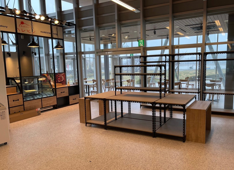 店舗リノベーション「道の駅 パン店」内装工事 施工例 道の駅をリノベーションして製パン工房を併設したできたてパンを提供する店舗を施工しました。