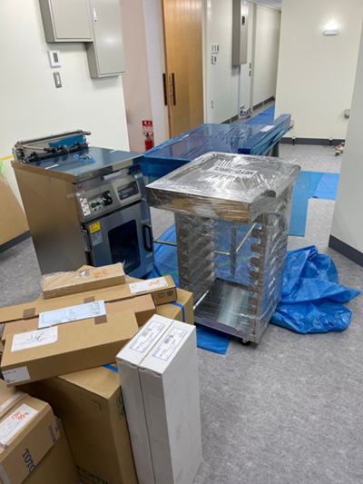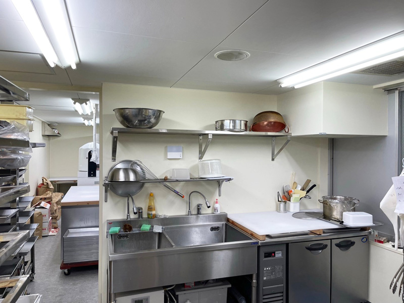 製パンに必要な様々な大型厨房機器や什器のセッティングを終えて厨房は工事完了