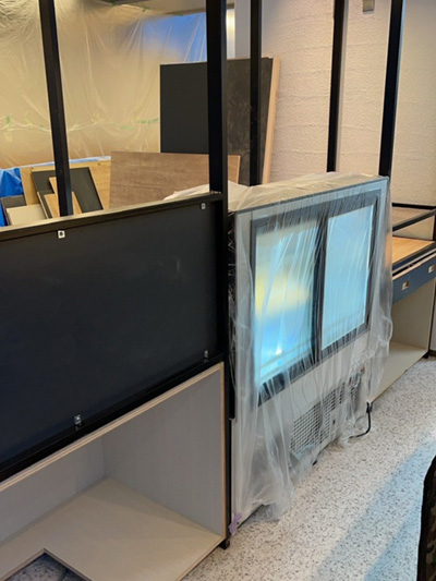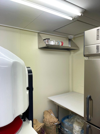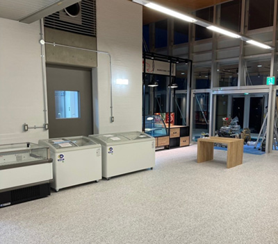店舗側にも冷蔵、冷凍の食品ケースを設置 パンを並べるディスプレー什器を待ちます