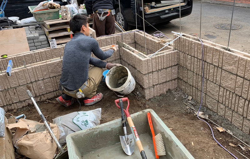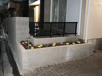 化粧ブロックの壁に一体化した花壇を組み込みました