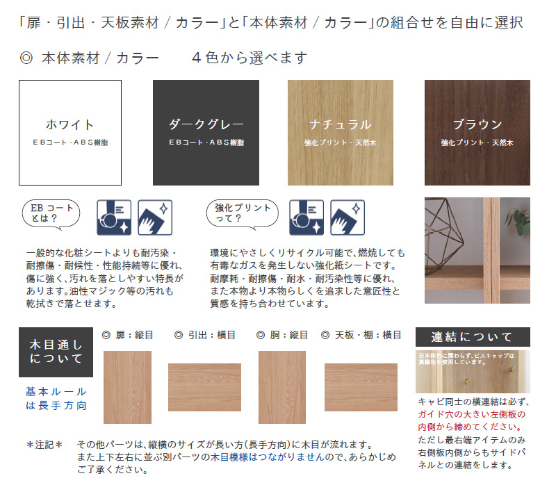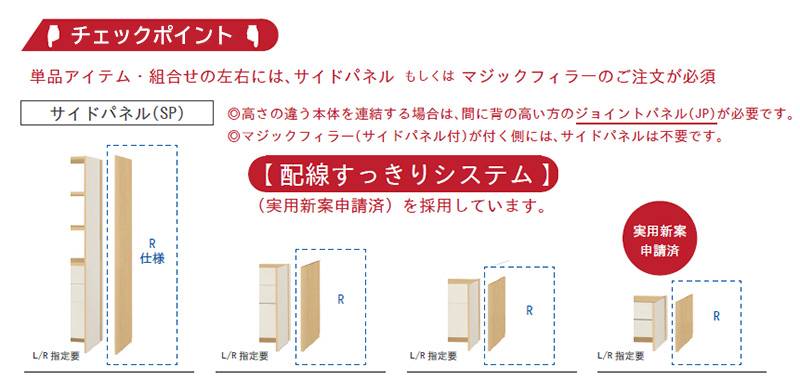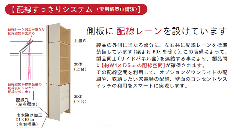 ■ 安心を選ぶ ホルムアルデヒド放散等級 F☆☆☆☆ ハンドルレスをはじめとするユニバーサルデザイン、天井突っ張りを採用した耐震仕様(施工を伴わないから床や壁に傷を付けにくく、設置も簡単)など、設計設備にも注意を払い、耐震対策や使い心地にこだわっています。