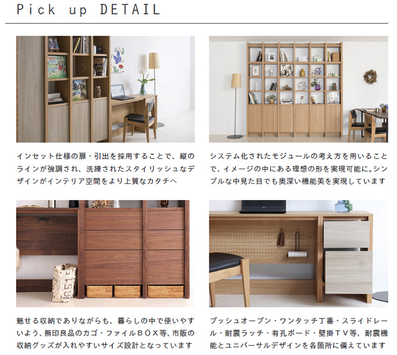 軸となる考えすえ木工の壁面収納は、初めて購入されるお客様でもスムーズに検討して頂けるよう、まずは欲しい機能・サイズに合わせて。決まった形のアイテムを選ぶことから始まります。 “お部屋に合わせて イージ−オ−ダ−” これは、発売当初から変わらない考え方です。 選ぶ楽しさ
