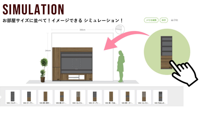 製造に関するすべての工程を国内自社工場にて行い、ご注文からお届け、アフターサービスまで”近くにいるからできること“を、お客様の安心に変える努力を続けます。 納入実績 15万5866件(2022年8月時点) シュミレーターを使ってレイアウトに挑戦すえ木工の壁面収納用シュミレーターを使えば、お部屋に合わせたプランをイメージすることができ、それに合わせて見積もりも作成することができます。