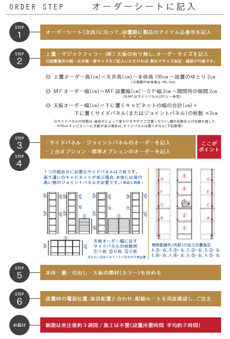 高さや幅、その他の加工、便利アイテムなど、すえ木工の壁面収納には、イージーオーダーとは思えないほど、お客様だけの製品をコーディネートする工夫が詰まっています。