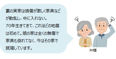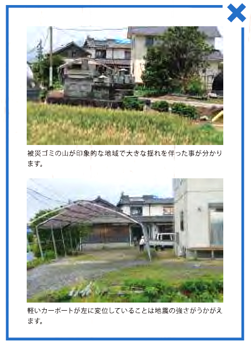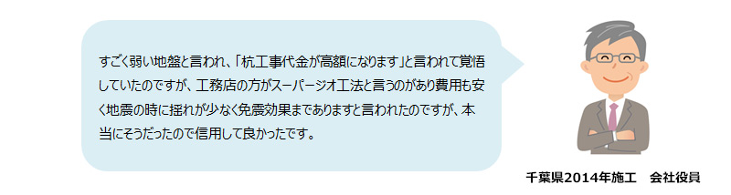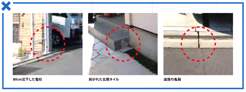2011年3月11日、未曾有の大地震においてもスーパージオ工法を導入した家は液状化・倒壊を免れました。 ![]() スーパージオ工法を施工下船橋市の住宅。 建物付近の土地では電柱の沈下やブロック塀の倒壊、地盤の浮き上がりなどが確認されたものの、スーパージオ工法を導入した建物には異常がありませんでした。 スーパージオ工法は熊本地震でもその安全性を証明しています近隣にてブロックの損傷や給湯機器の傾きや室外機の移動などがあったが、M邸に於いては損傷はみられません。軟弱地盤地に於いて地盤置換え工法の効果を確認できました。 ![]() 近隣住宅では地震の揺れは強く家具が倒れ皿が割れるなど被害が報告されています。 ![]() ![]() お客様の声『安心の住まいを 住宅免震システム「スーパージオ工法」の安全性実例』