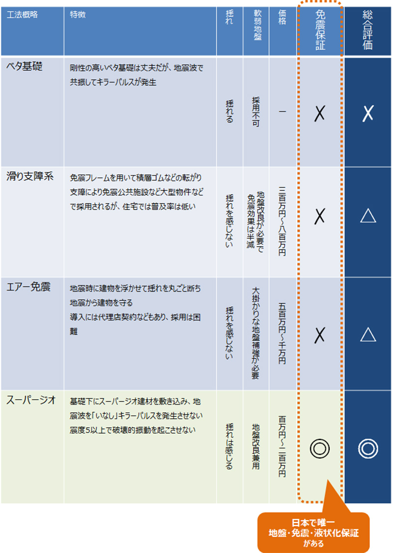 日本で唯一!地盤・免震・液状化保証があるスーパージオ工法 他の地盤改良工法や免震工法との比較です!安心の住まいを 住宅免震システム「スーパージオ工法」他の工法との比較