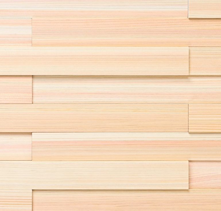 津山産の最高品質の檜を職人の手で1ピースずつ手間を掛けて嵌め込みました。イマガワの壁面パネル