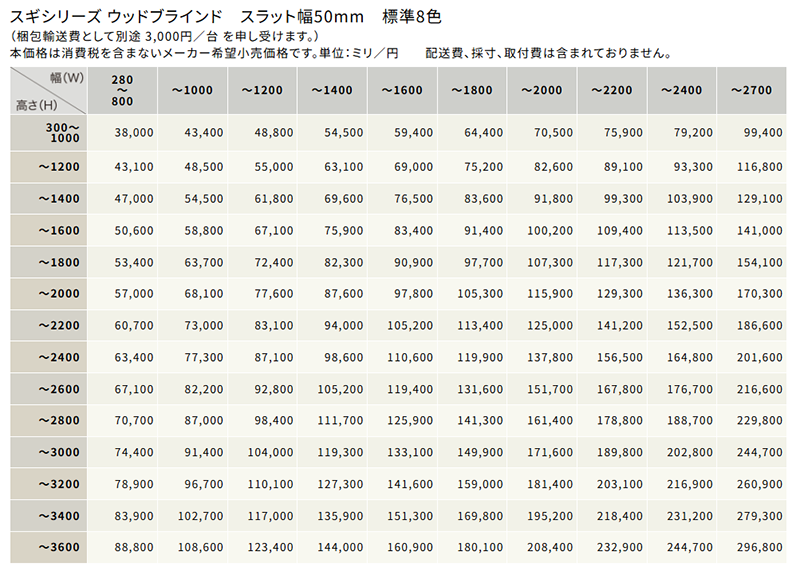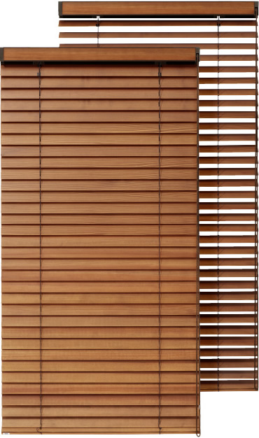 スラット幅は50mm、仕上げ色はウッドブラインドでポピュラーな標準8色で、杉材の木目や色の変化を生かした自然な表情を持つ仕上げです。特注色にも対応します。