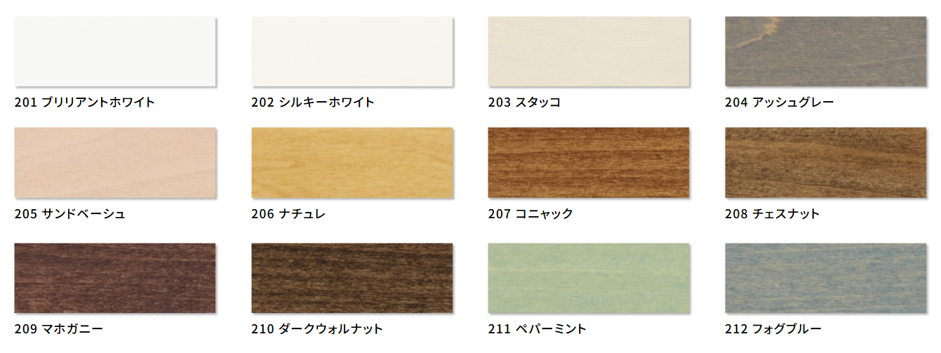 Gシリーズは、無垢の木が持つ質感を生かした色味、程よい光沢と深みのある上品なサテン仕上げが特徴です。 仕上げ色(標準12色)