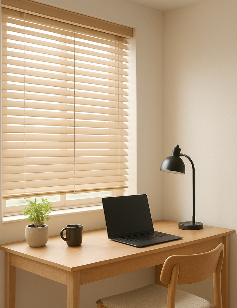 在宅ワークをされている方へ、デスク周りの窓にウッドブラインドを取り付けてみませんか? ホームオフィス