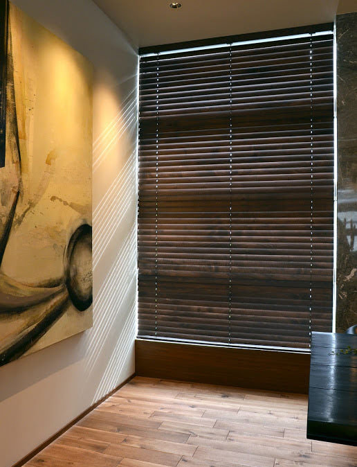 光の調整ができるウッドブラインドは、ダークトーンでも重たくなりすぎずに、